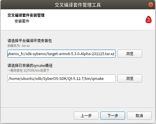 选择平台编译环境安装包(target)(不需要解压),及Qt 5.12.11的qmake路径,下一步